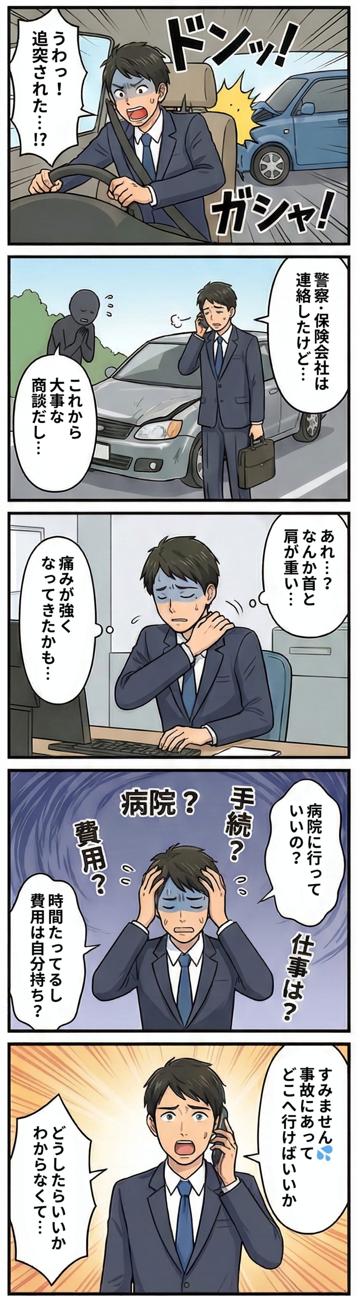 そのため、交通事故で起こったむち打ち、腰痛、肩の痛み、しびれ、膝・股関節の痛み、全身のだるさなどは普通のものとは異なります。